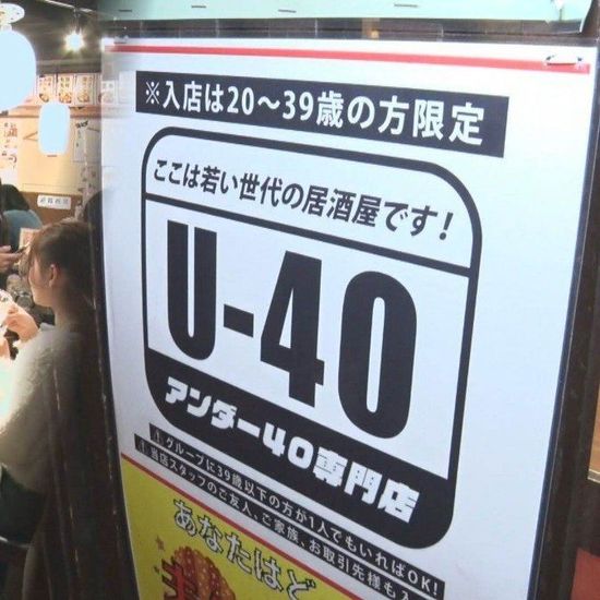 | 「40歳以上お断り」「25歳以上限定」 年齢制限の飲食店が続々と 入り口を見ると、「※入店は20〜39歳の方限定 ここは若い世代の居酒屋です! アンダー40専門店」という貼り紙がありました。 なんと40歳未満の人しか入れない… (出典:テレビ朝日系(ANN)) |