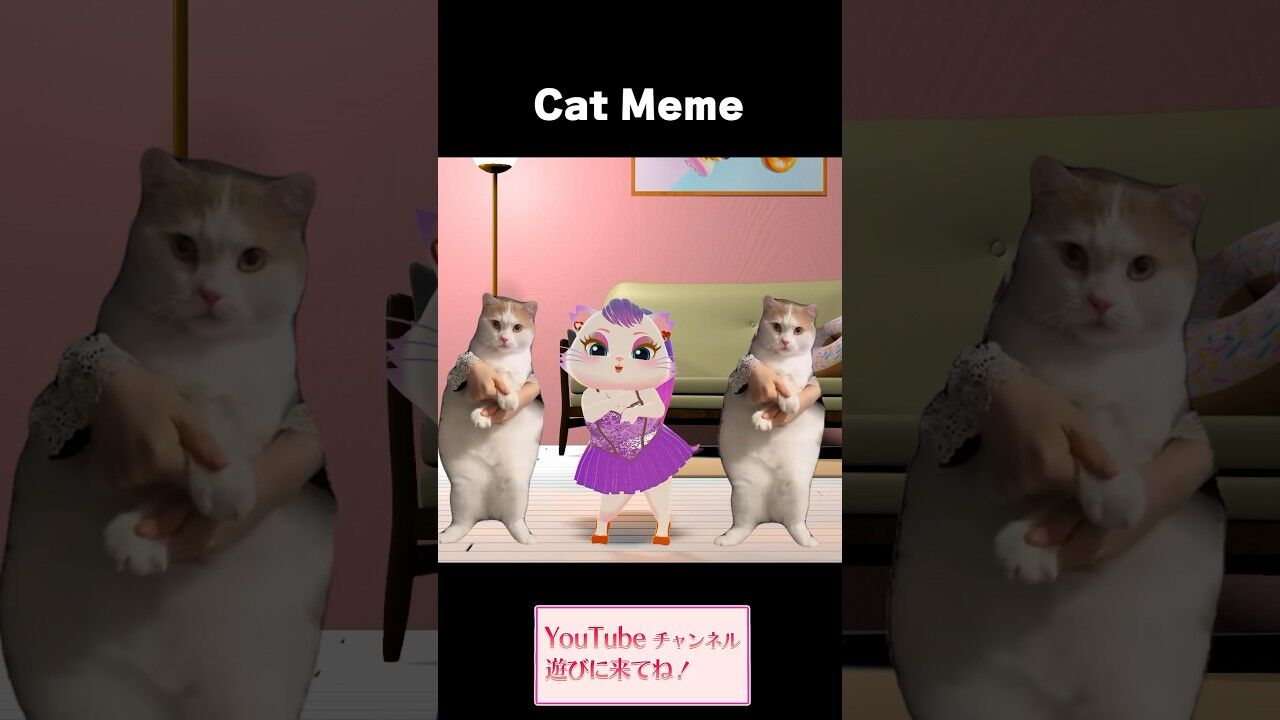実写の猫の映像を切り抜き背景の前に並べた動画に字幕をつけて作る動画をミームといいます。