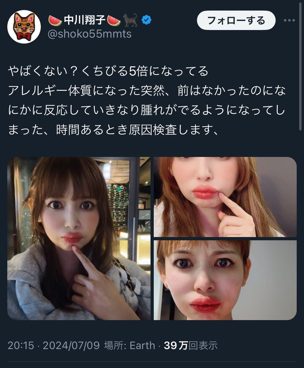 中川翔子さん、大丈夫ですか?唇が5倍に腫れるなんてすごく心配です…早く良くなることを祈っています。