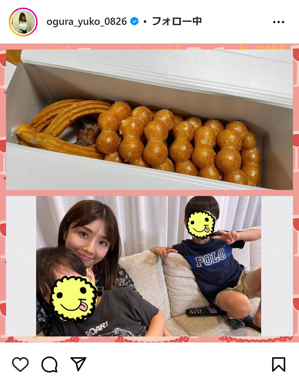 小倉は「今日は長男がどうしてもミスタードーナツが食べたいと言うので、お店に行ってみたらびっくり!! !! かなりの方が並んでいる!! !!」と、ミスドに行列ができていたと報告。「並ぶこと1時間 息子たちが大好きなポン・デ・リングを買うことができました 美味しかったです」と、息子達とドーナツの写真を投稿した。