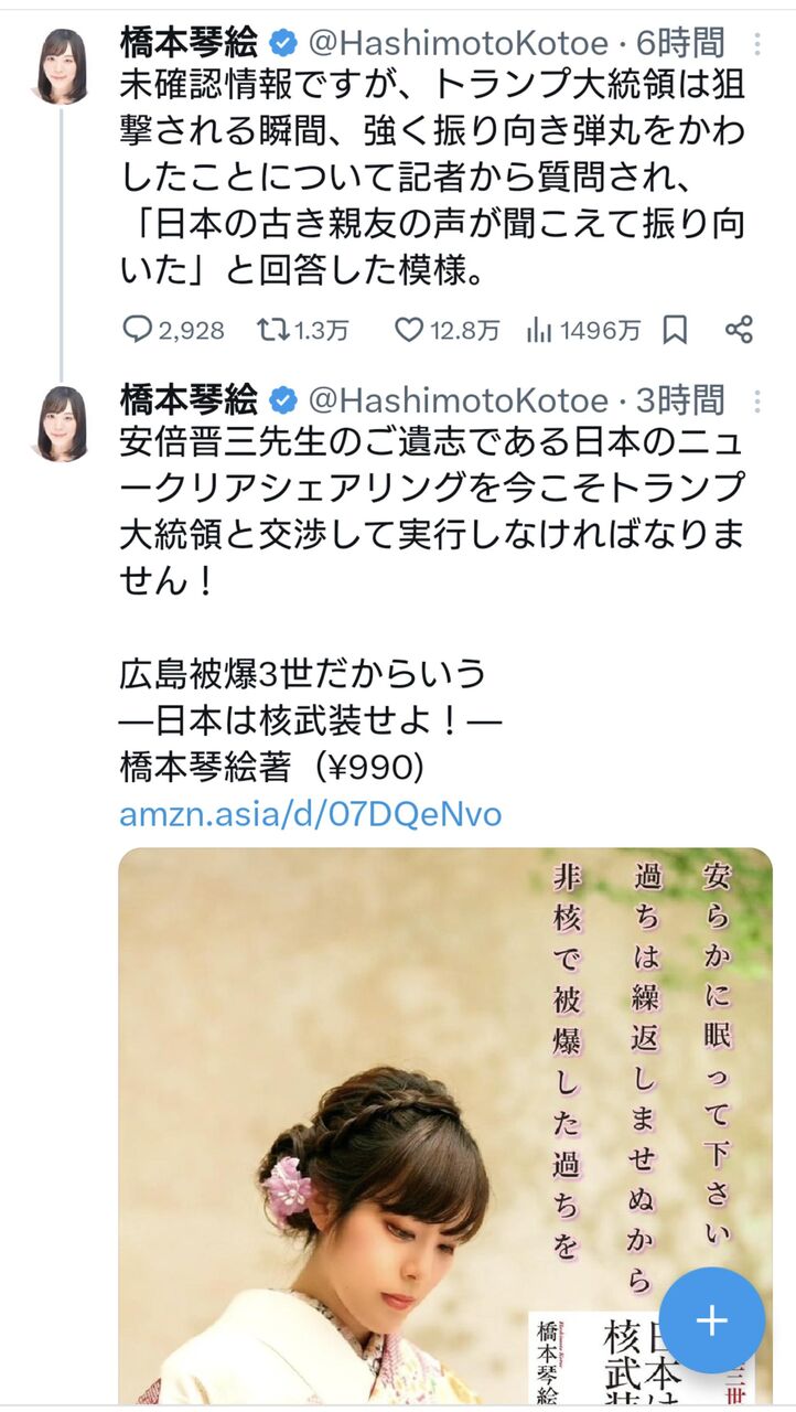 安倍昭恵さんの投稿には共感しかできません。トランプ氏銃撃事件の日に、平和的なメッセージを発信することはとても重要だと感じます。