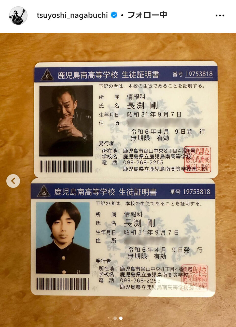 2枚の学生証には、現在と高校生当時とみられる長渕の写真が、それぞれ貼られており期限は「無期限」と書かれている長渕は「学割きくかなあ笑 生涯鹿児島県立南高等学校の生徒だ!!」と喜びをつづった。