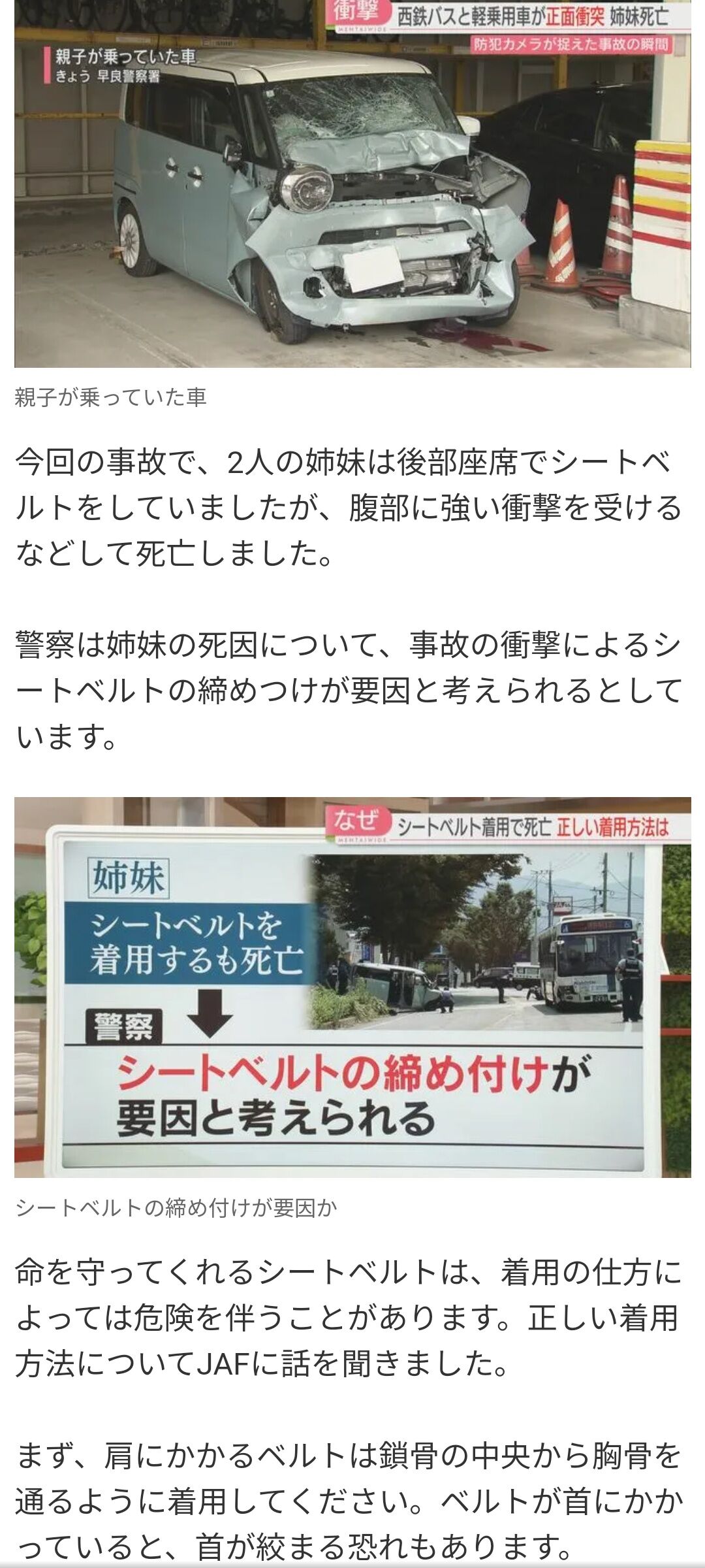 【続報】7歳と5歳の姉妹が死亡の事故 衝撃によるシートベルトの締めつけが要因か「チャイルドシートやジュニアシートを使って」