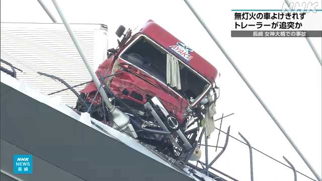 長崎・女神大橋で追突事故。事故は駐停車禁止の車と大型トレーラーの関係や運転者の状況を詳細に伝える。
